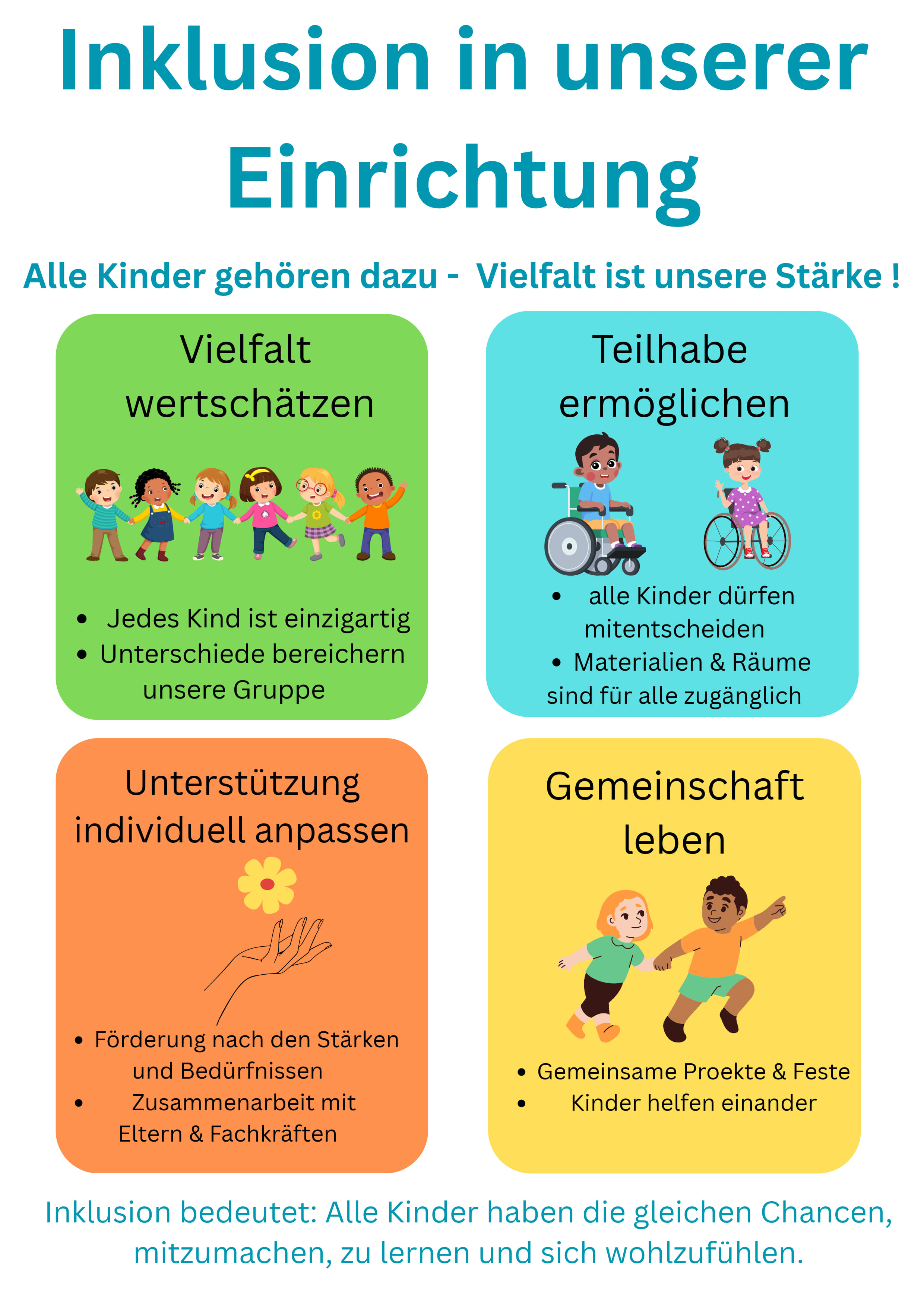 „Es gibt keine Norm für das Menschsein. Es ist normal, verschieden zu sein.“ (Richard Weizsäcker) Wir sind ein Kindergarten, in dem Inklusion gelebt wird. Wir bieten eine Chance für alle Kinder sich selbst und die anderen in ihrer jeweiligen Besonderheit zu akzeptieren und einander vorurteilslos und angstfrei zu begegnen, unabhängig von Alter, Geschlecht, Kultur, geistigen oder körperlichen Beeinträchtigungen.