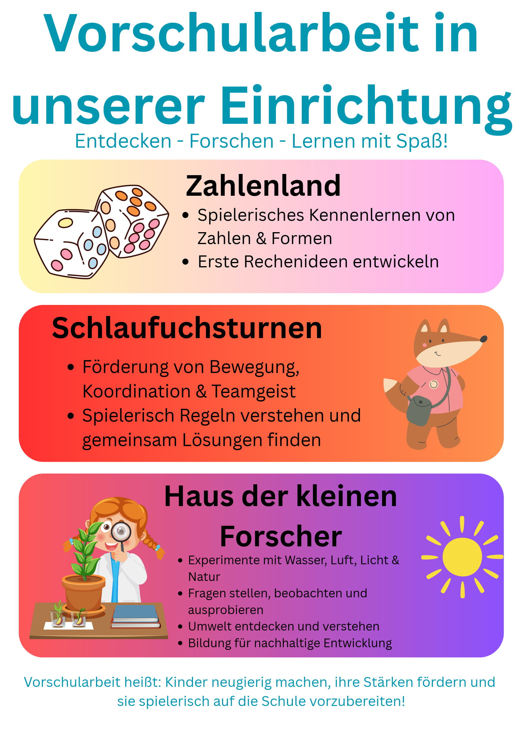 Unsere Einrichtung zeichnet sich durch die Schwerpunkte Inklusion, Anerkannter Bewegungskindergarten und Haus der kleinen Forscher aus.