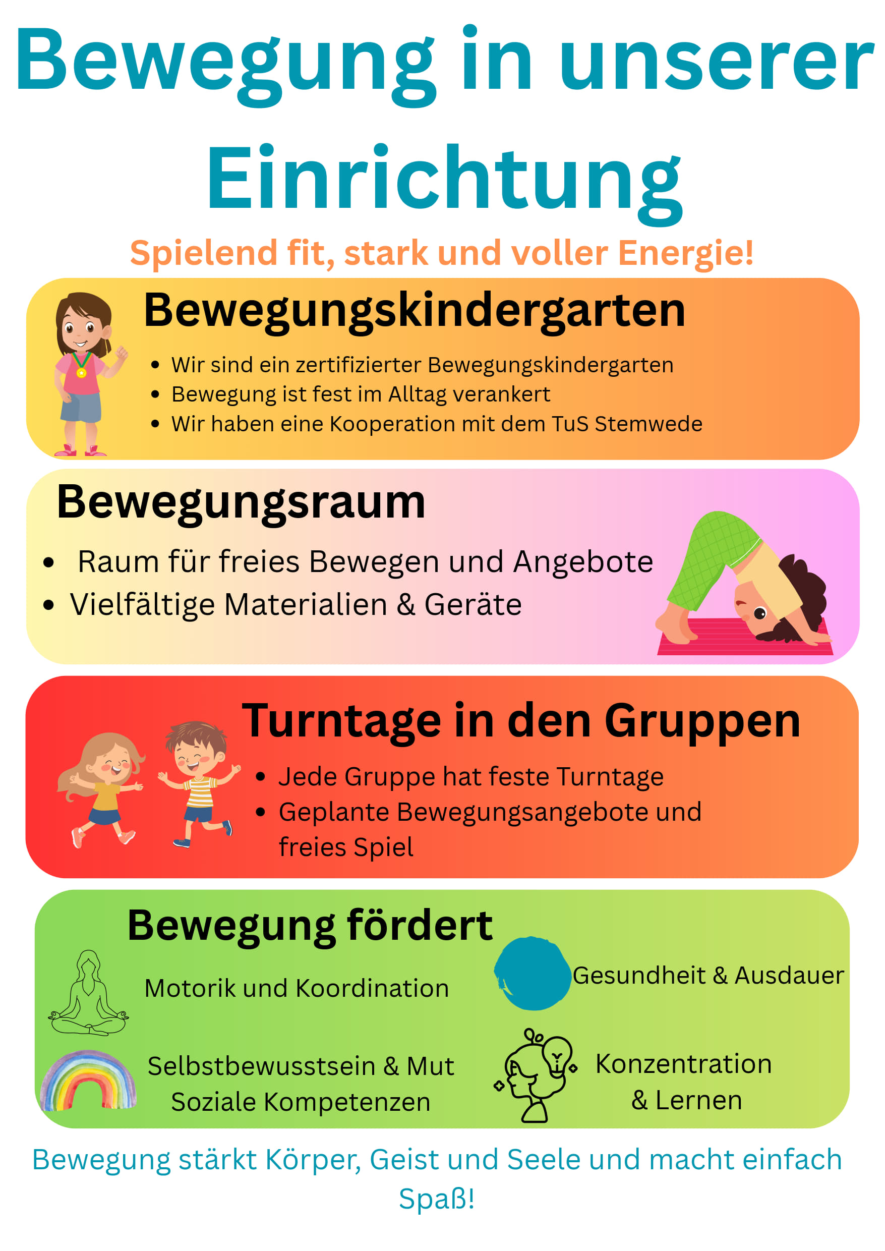 Als anerkannter Bewegungskindergarten ist Bewegungsförderung ein täglicher Bestandteil unserer pädagogischen Arbeit, sodass die Kinder viele Gelegenheiten bekommen, ihrem Bewegungs- und Betätigungsdrang nachzukommen. Außerdem haben sie jederzeit die Möglichkeit, durch Entdecken, Erproben und Experimentieren, ihre eigenen körperlichen Grenzen kennenzulernen und Sozial- und Materialerfahrungen zu sammeln.